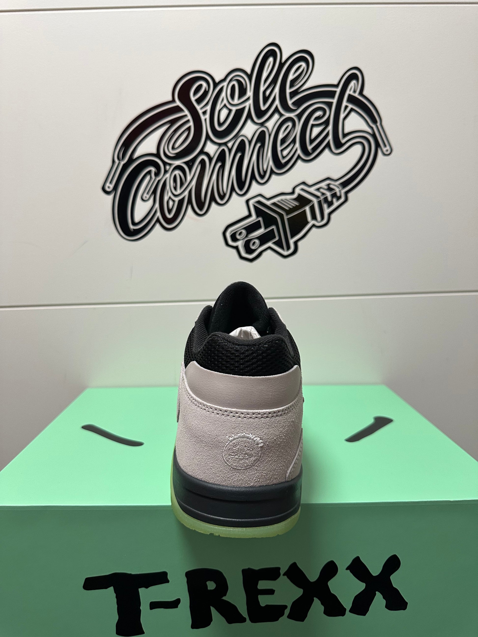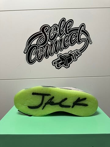 The Chase B x Travis Scott x Jordan Jumpman Jack TR 'Black Night Silver' dons a black mesh upper with off-white suede on the eyestay, heel overlay and toe wrap. Black ostrich leather lands on the adjustable midfoot strap piped in reflective accents. A reversed off-white suede Swoosh decorates the side panel, while a pink embroidered Jumpman adorns the tongue. A green, glow-in-the-dark rubber outsole engulfs part of the black foam midsole for a distinct look.